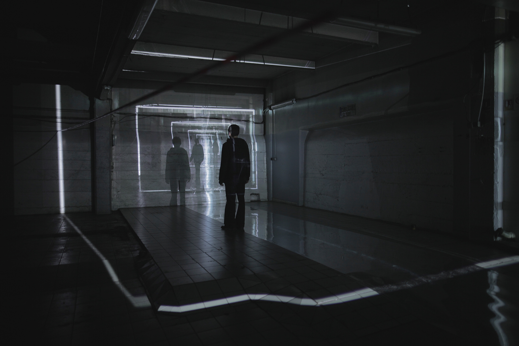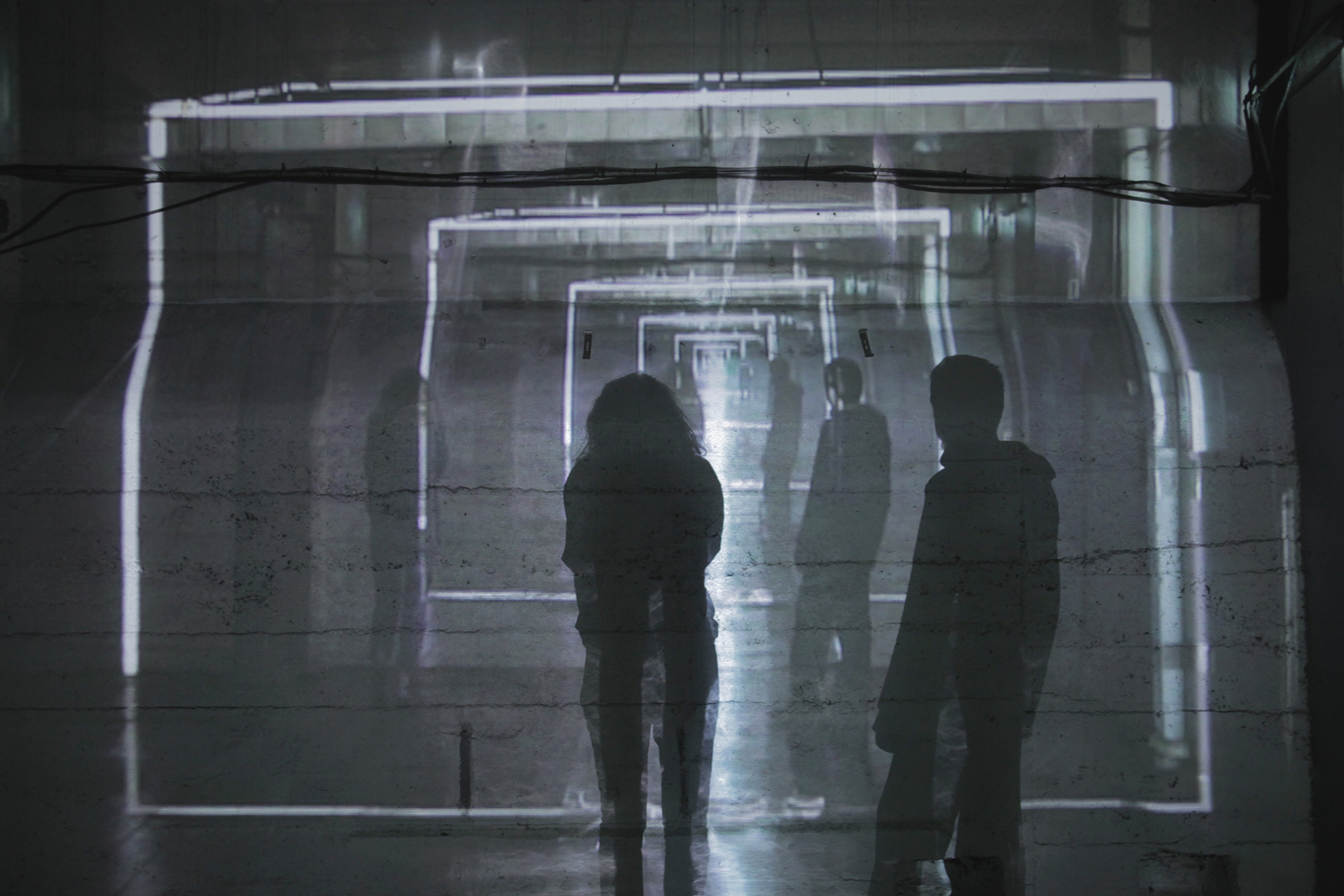 Une camera filme une rampe en temps réel. Un projecteur transmet cette image avec un délai aléatoire de quelques secondes. L’image filmée est projetée en un délai qui crée une perte de repères : le spectateur suit et observe un nombre infini de versions de lui-même, avançant dans un tunnel où son image est mise en abîme, véritablement dans le passé. Un univers éphémère, où le sujet en mouvement reste dans un perpétuel état transitoire.