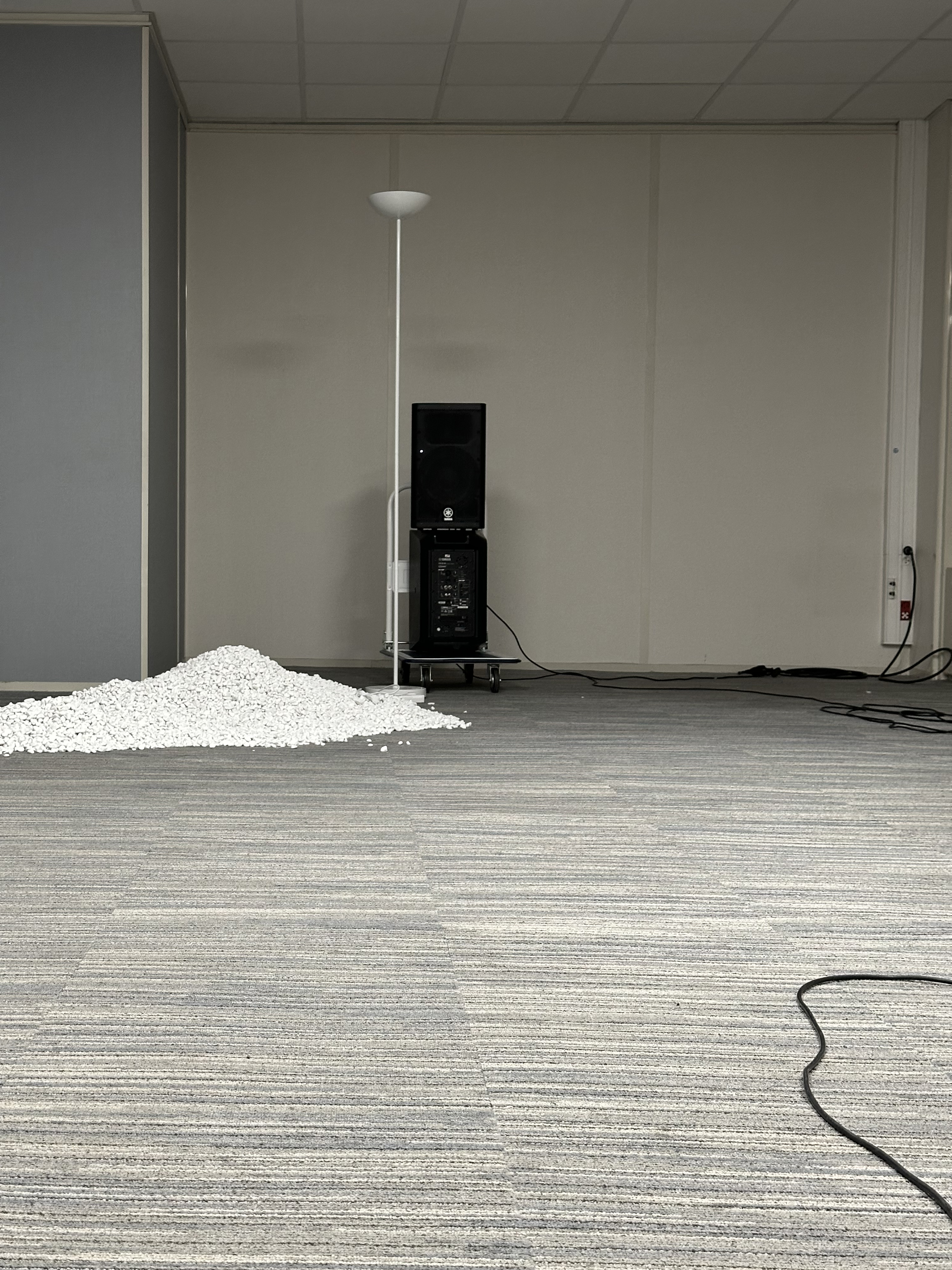 - Les nuits du 9 et 10 octobre 2023, l’artiste a enregistré la réverbération des pièces du Musée Transitoire et en a modélisé les espaces afin de créer une empreinte de l’acoustique des pièces. Cet échantillonnage des espaces du Musée a été complété d’un enregistrement de sons créés à partir des objets abandonnés dans les lieux.