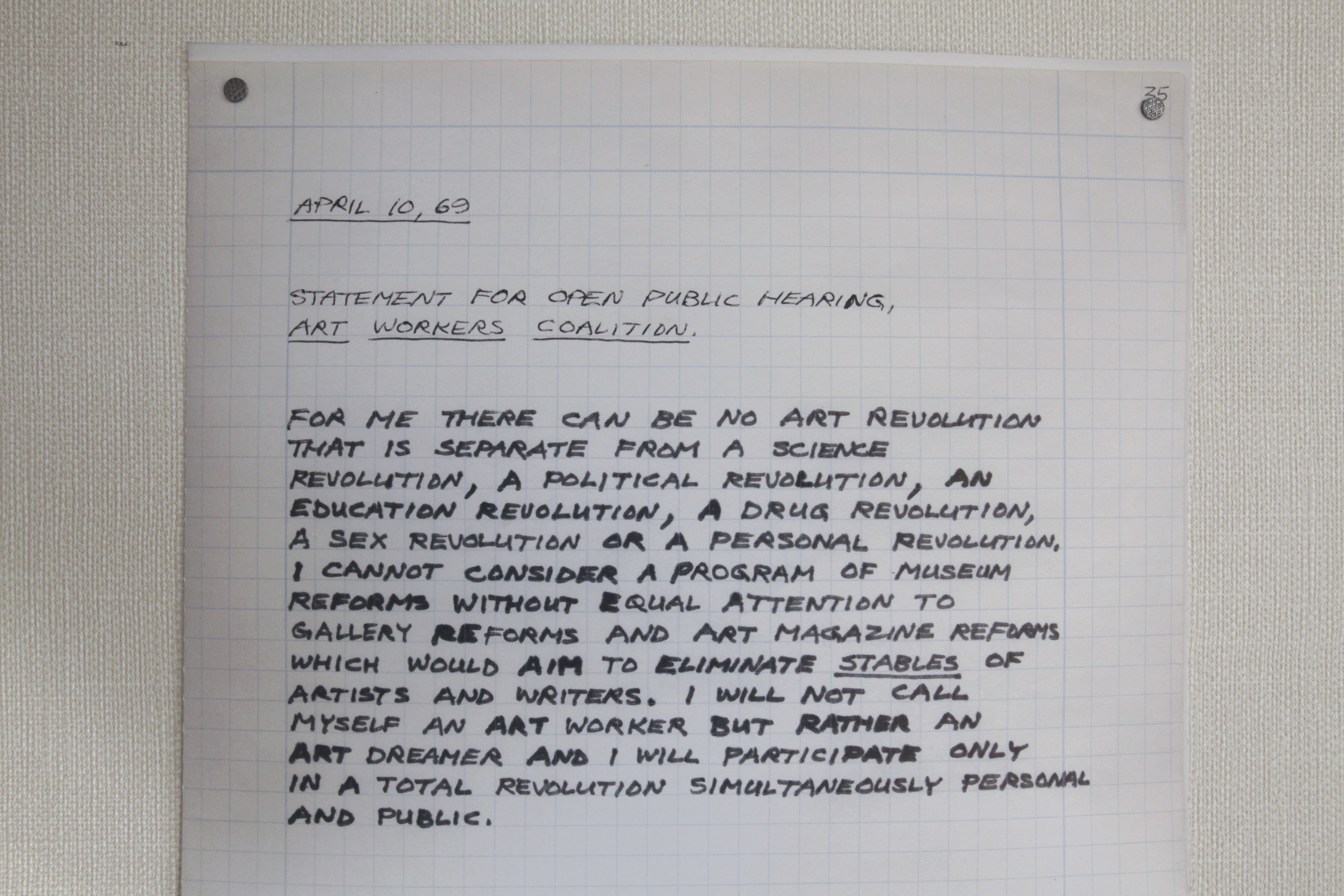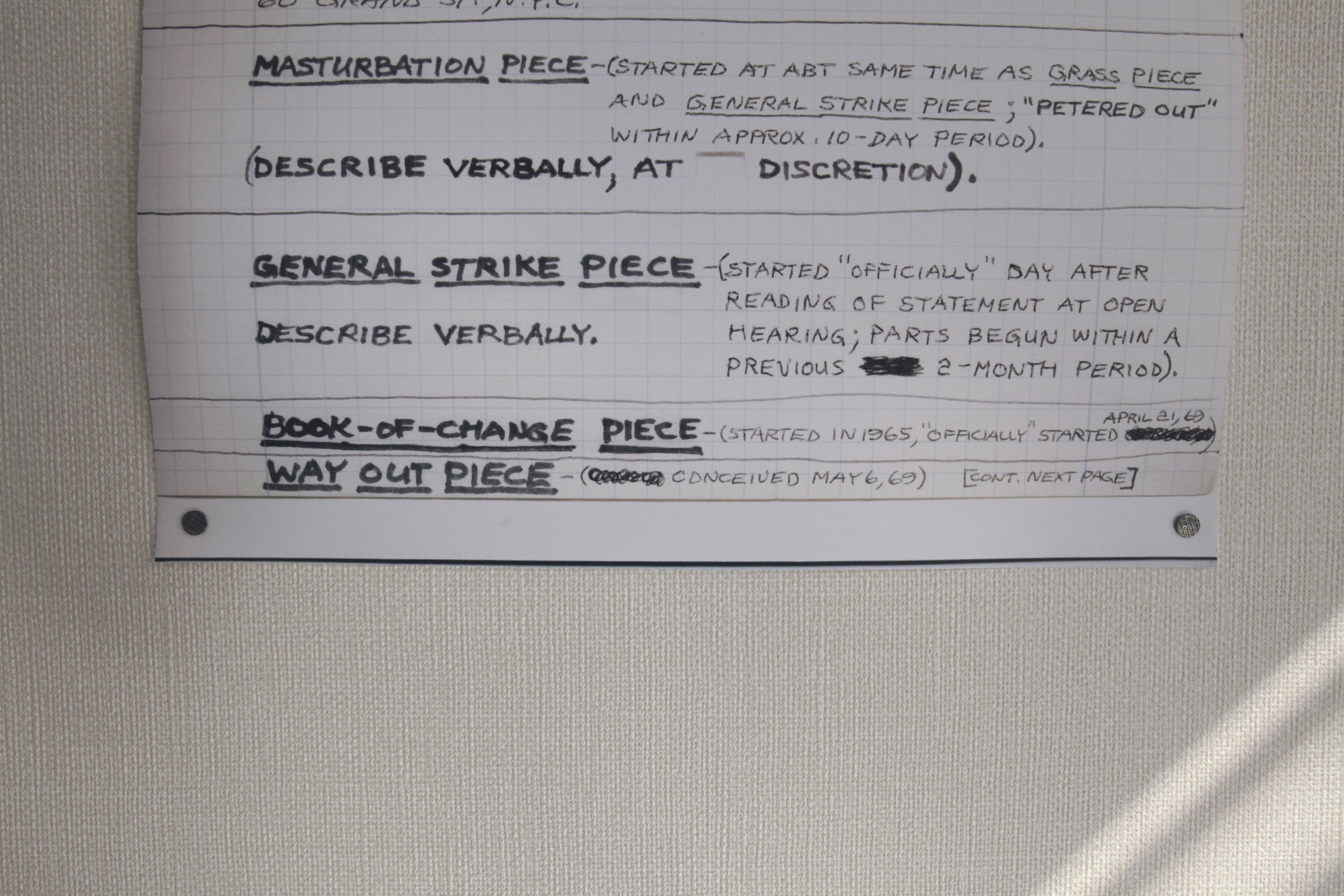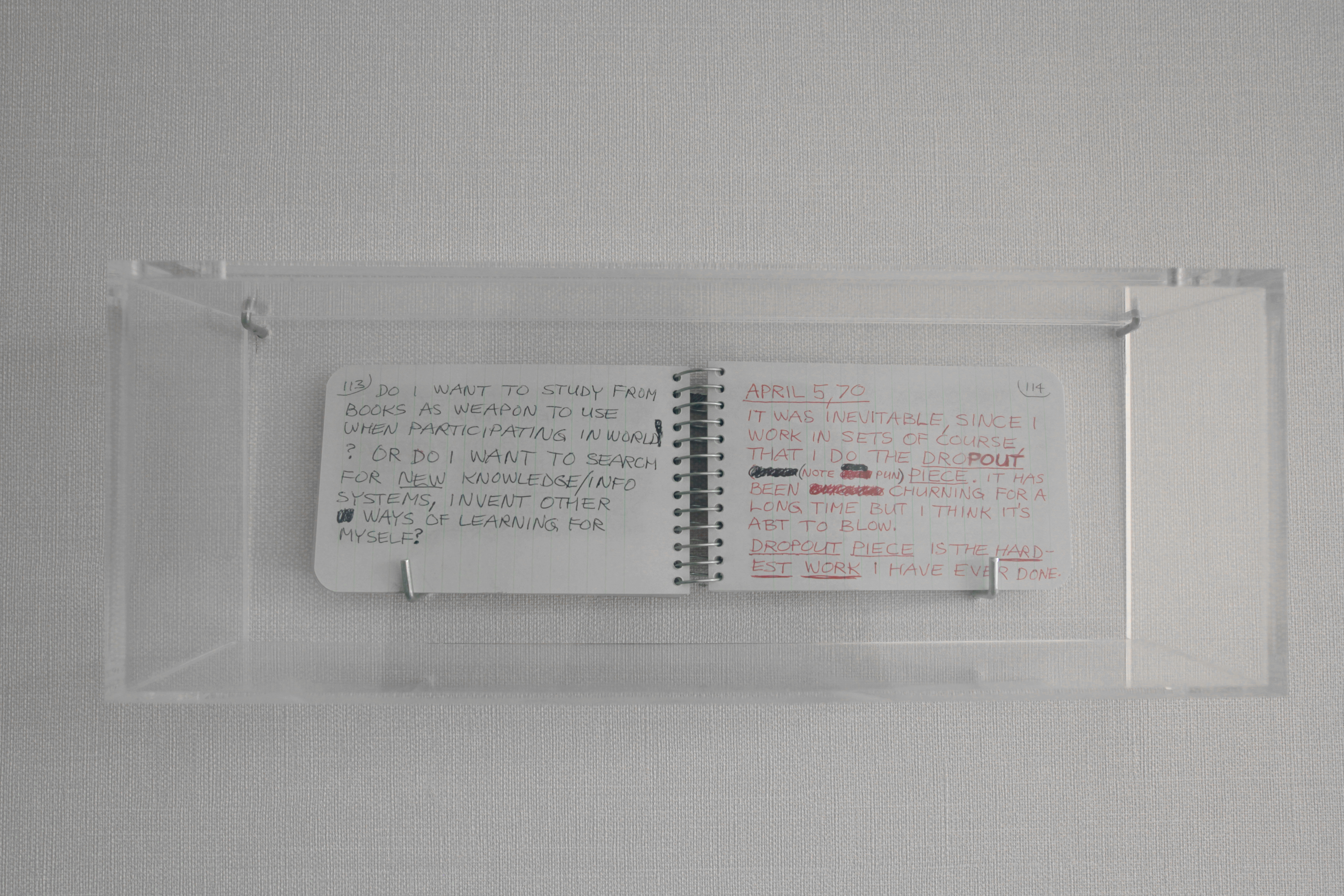 «En avril 1970, l’artiste américaine Lee Lozano rédige dans un de ses carnets un texte qu’elle nomme Dropout Piece. Faisant suite à sa grève générale qui, débutée en 1969, annonçait son retrait progressif du milieu de l’art, elle envisage dans ce «Dropout » d’abandonner toute ambition et travail artistiques. En effet, quelques temps après, elle disparaîtra de la scène new-yorkaise minimaliste et conceptuelle avant de déménager à Dallas où elle mourra en 1999. Son travail propose d’envisager le paysage politique, social et artistique qui borde ce geste de renoncement et les perspectives qu’il ouvre aujourd’hui sur les frontières de l’art et de la vie, les régimes de visibilité et les compromissions qui organisent le milieu artistique. » Texte : Elsa Vettier