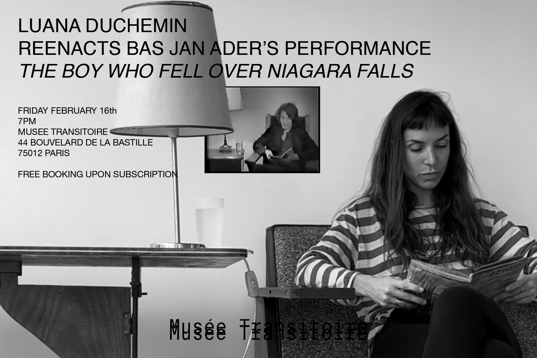 Pour Le droit à l’oubli, l’actrice Luana Duchemin réactive la performance The Boy who fell over Niagara Falls, dans laquelle Bas Jan Ader lisait l'histoire d'un garçon qui avait survécu aux chutes du Niagara dans un petit bateau, en ponctuant chaque ligne de l'histoire d'une gorgée d'eau avant de se lever et de s’en aller.